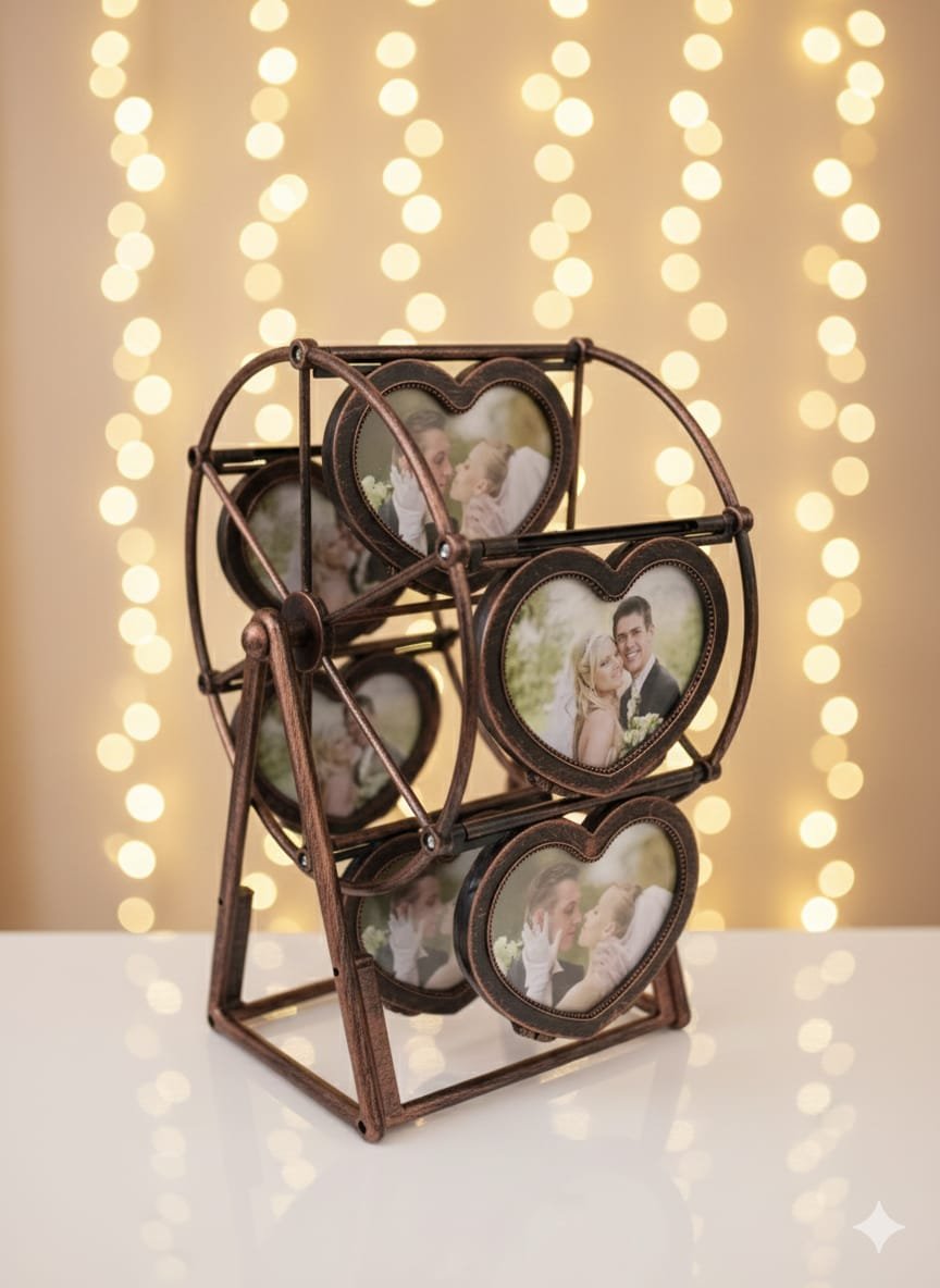 برواز مبتكر بتصميم دولاب الصور (فيريس ويل)، يتيح لك عرض مجموعة من الصور العائلية أو الشخصية بطريقة فنية مبهجة. هيكل معدني بتشطيب عتيق يضفي لمسة كلاسيكية، مع إمكانية دوران الصور لإحياء الذكريات من كل زاوية. قطعة ديكور مثالية تضيف روحًا دافئة لأي مساحة، وتلفت الأنظار بجمالها الفريد.