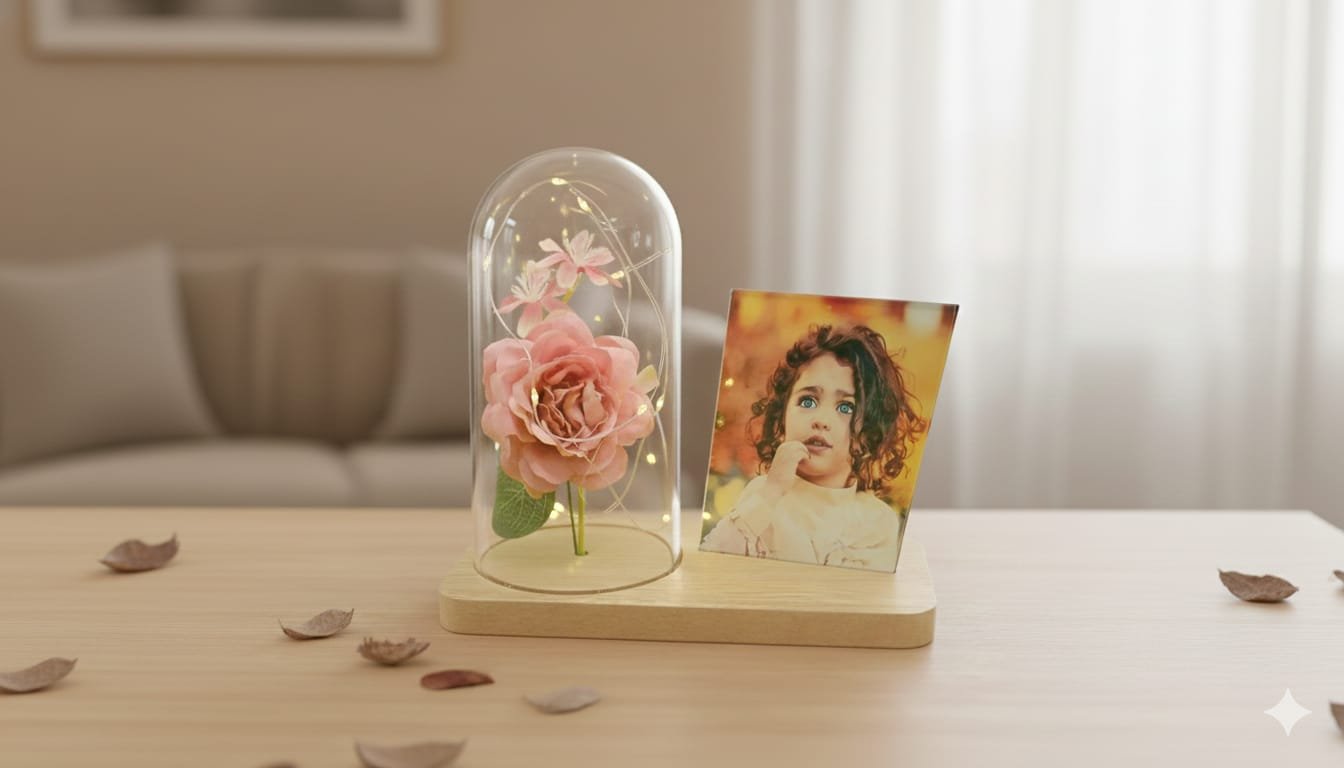 احتفظ بجمال اللحظة في قبة زجاجية أنيقة تحتضن زهرة وردية محفوظة، مضاءة بإضاءة LED دافئة تضفي سحرًا وهدوءًا على المكان. تصميم فني يجمع بين الذوق والحنين، مثالي لتزيين الطاولات أو تقديمه كهدية تحمل مشاعر صادقة في المناسبات الخاصة. قبة زجاجية شفافة تحافظ على جمال الزهرة لأطول فترة