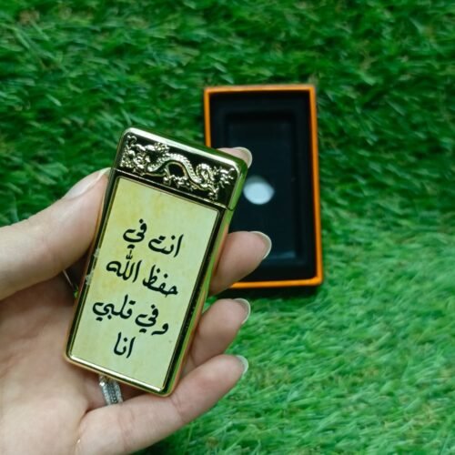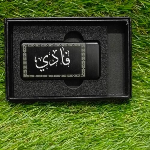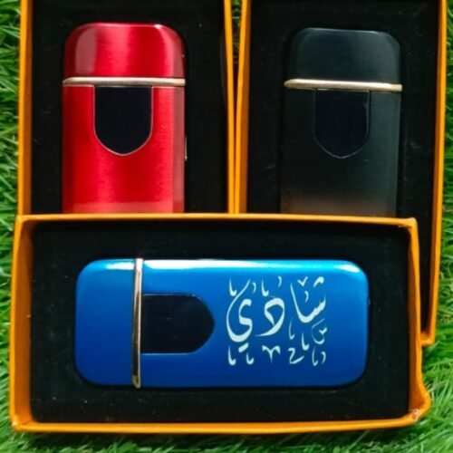 قداحة إلكترونية بتشتغل بالشحن، تصميمها أنيق وبتنعمل حسب الطلب – يعني بتختار الاسم أو الكلمة اللي بدك تنطبع عليها بخط عربي مميز. فيها سلك هيتر بيشتغل بدون نار أو غاز، ومناسبة كهدية شبابية أو استخدام شخصي.