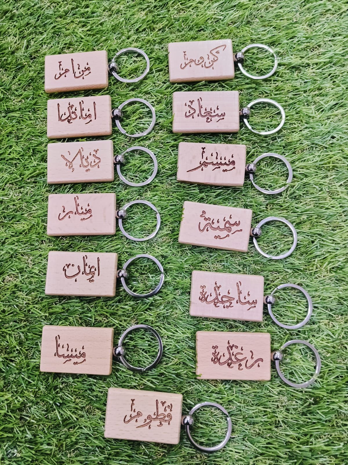 ميدالية مفاتيح أنيقة مصنوعة من خشب طبيعي، عليها حفر ليزر حسب الطلب – يعني بتختار الاسم، العبارة، أو الرمز اللي بتحب ينحفر عليها. شكلها بسيط بس فيها لمسة فنية، وبتنعمل بأشكال متعددة مثل دائري، مستطيل، قلب، أو بيضاوي. مناسبة كـ هدية شخصية، توزيعات مناسبات، أو حتى قطعة يومية بتحملها معك وين ما تروح.