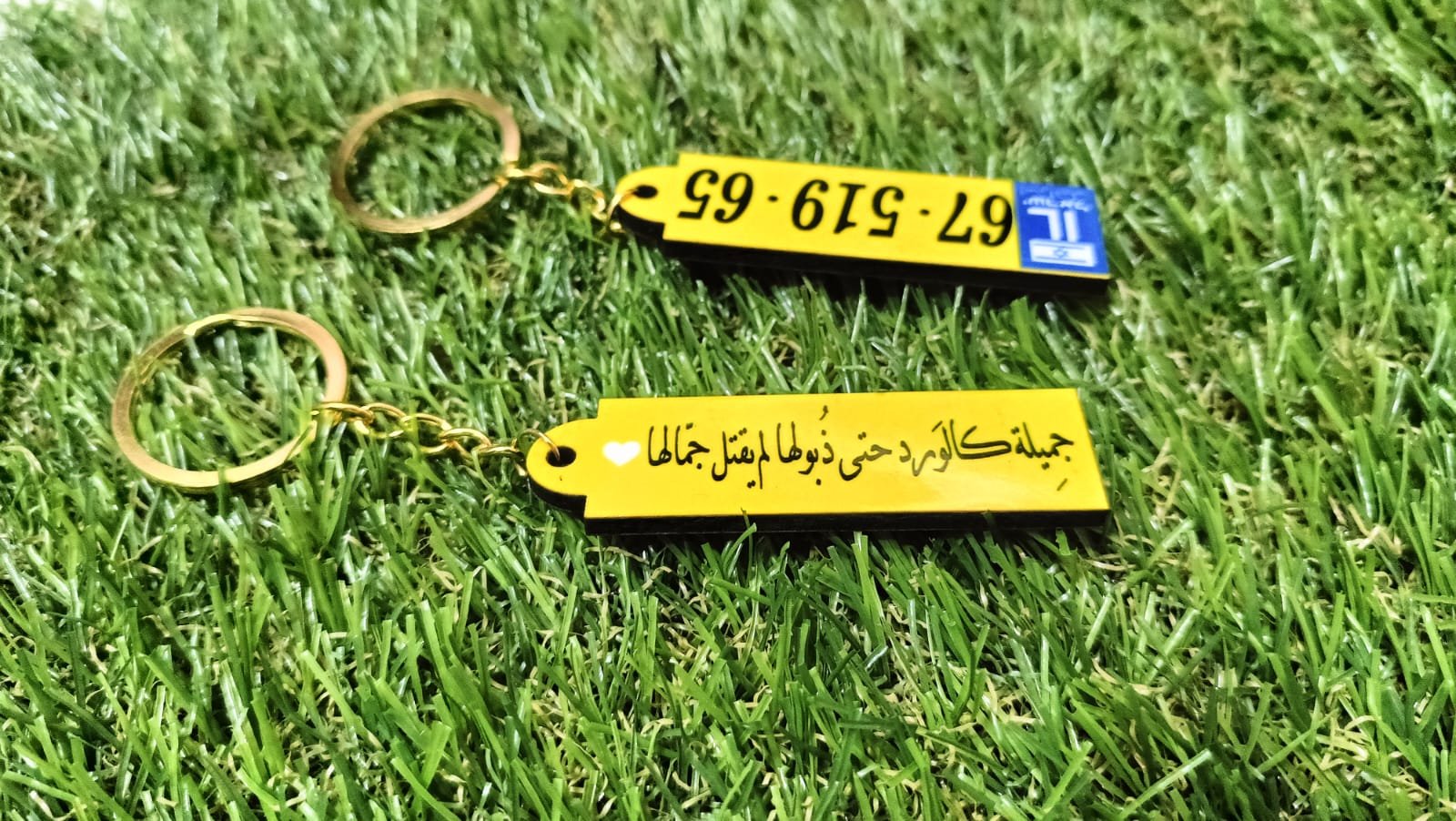 ميدالية مفاتيح أنيقة مصنوعة من خشب طبيعي، بتنعمل عليها طباعة على الوجهين حسب الطلب – يعني بتختار صورتين، أو صورة وعبارة، أو حتى شعار خاص فيك. الطباعة بتكون بجودة عالية وثابتة، والألوان واضحة ما بتبهت مع الوقت.