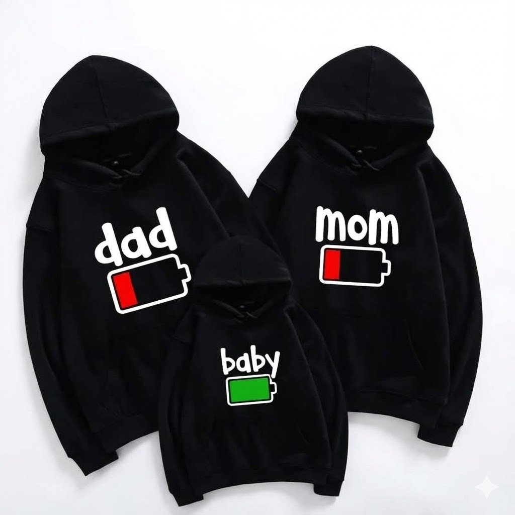 أضف لمسة من المرح إلى إطلالتكم العائلية مع طقم هوديز مطبوع بتصميم البطاريات المعبر! “Dad” و”Mom” ببطاريات منخفضة، و”Baby” ببطارية ممتلئة – تعبير طريف عن واقع الحياة اليومية، ويمكن تخصيص كل قطعة باسم أو رمز تعبيري خاص.