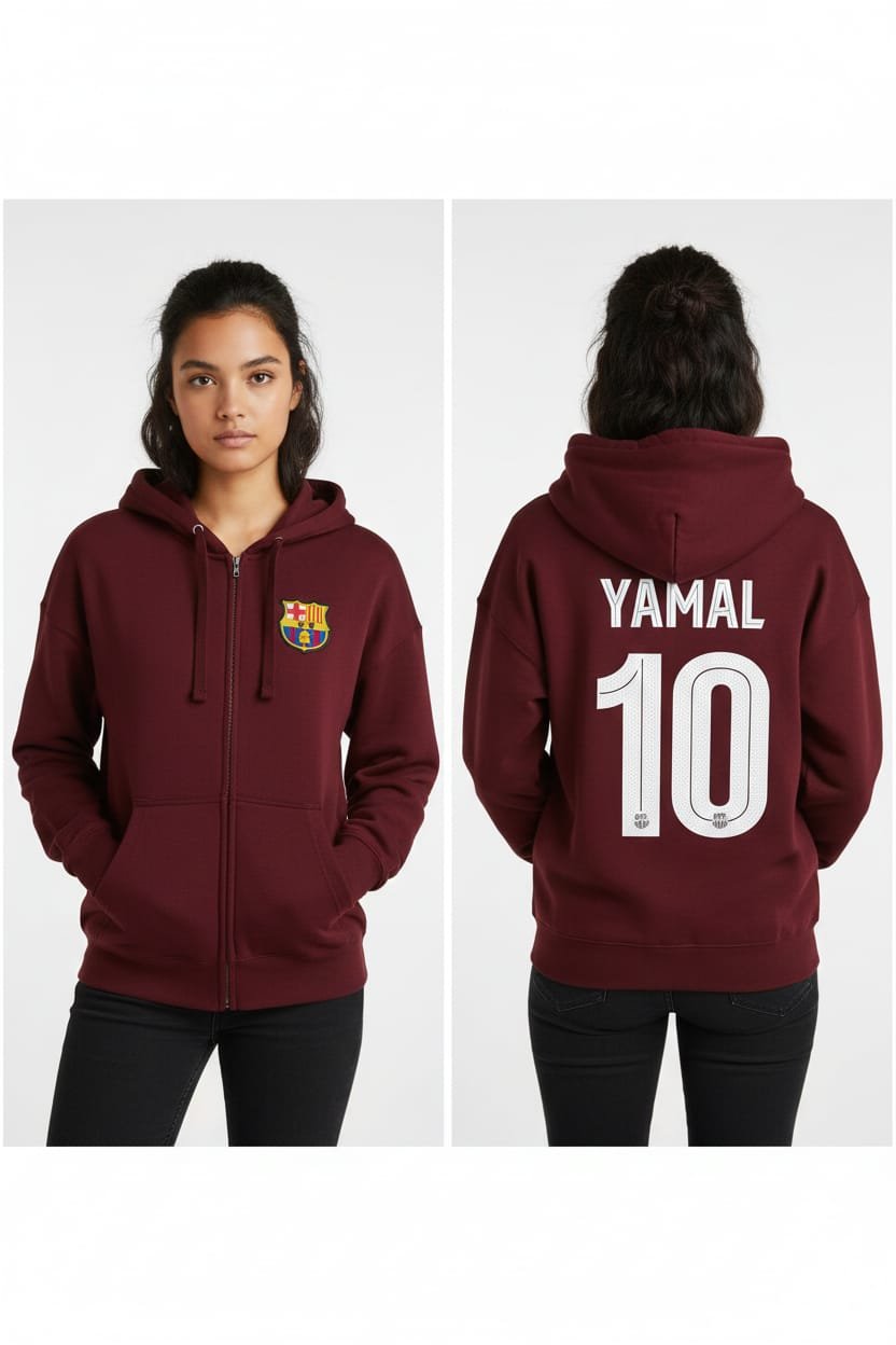 هودي فاخر بلون خمري مزود بسحاب أمامي، يحمل شعار نادي برشلونة على الصدر، واسم اللاعب YAMAL مع الرقم 10 مطبوعين على الظهر.